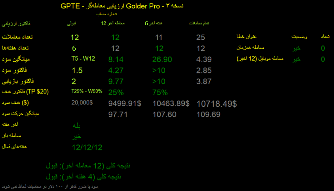 معاملهگری که تمامی معیارهای ازریابی عملکرد را رعایت کرده است، به عنوان یک معاملهگر موفق شناخته میشود. در شکل ۱، نتیجه عملکرد یک معاملهگر موفق را بصورت کارنامه فارسی و در شکل ۲، نتیجه عملکرد یک معاملهگر موفق را بصورت کارنامه انگلیسی مشاهده میکنید که میانگین سود بالاتر از حداقل تعیینشده و سایر شاخصها در حد مطلوب هستند.