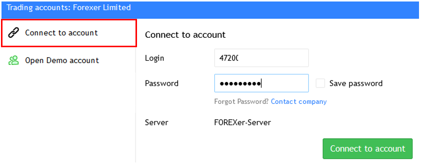پس از انتخاب نرم افزار فارکسر تحت وب، در این پنجره وارد قسمت Connect to account شوید.